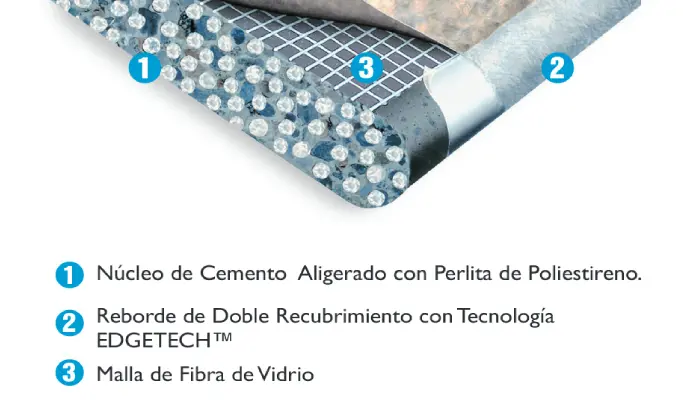 Panel de con un núcleo cemento aligerado, altamente resistente al exponerse al agua y a los impactos.